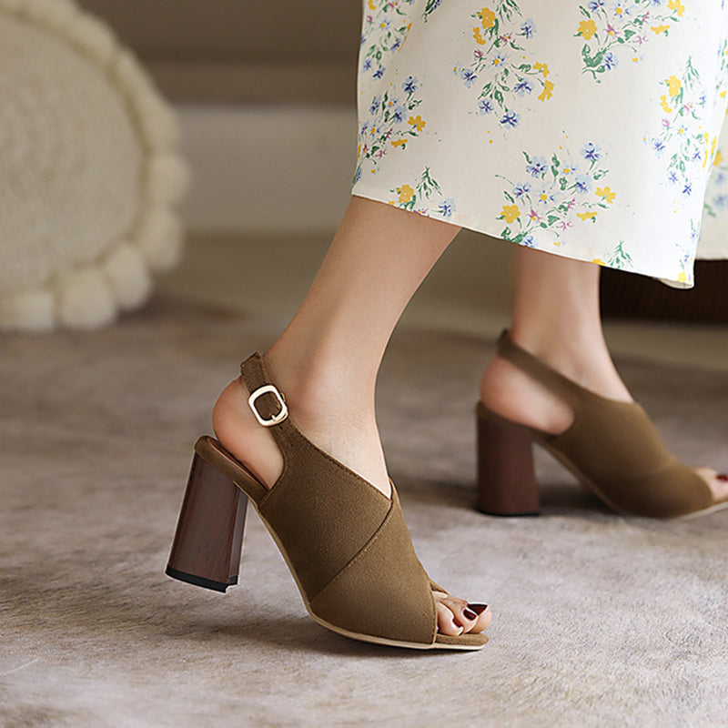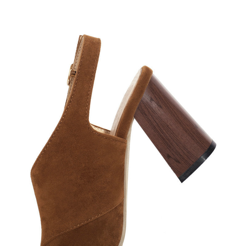 Item type: SandalsGender: WomenToe Shape: Peep toeHeel Height: 3.15" (8cm)Upper Material: Faux suedeClosure Type: BuckleSeason: SummerOccasion: Daily, CasualColor: Brown, Black, Apricot, Coffee