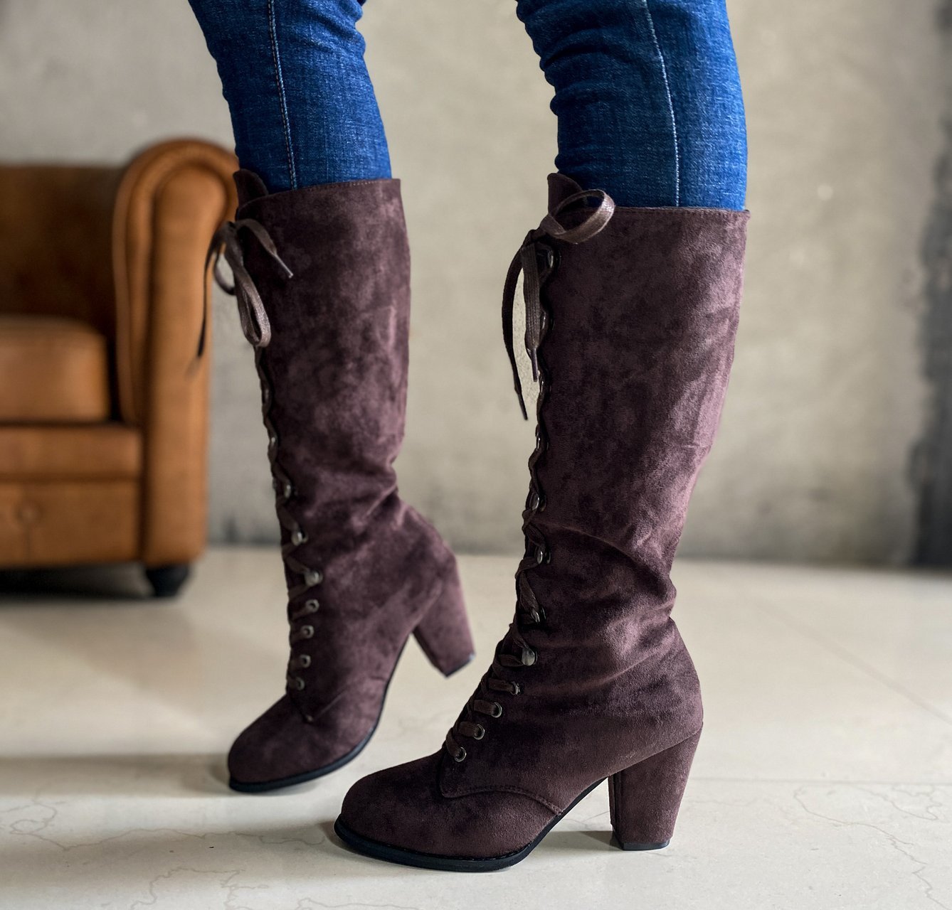 Item Type: BootsOutsole Material: RubberUpper Material: Faux SuedeClosure Type: Lace-upToe Shape: Round ToeSeason: Spring, Autumn, WinterHeel Type: Chunky HeelHeel Height: High Heel (8cm)Boot Height: Mid CalfColor: Black, Brown, Blue